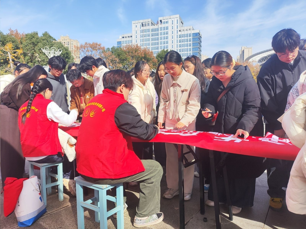 白天,校文明广场举办的大型防艾主题宣传活动有序开展。同学们分组参与红丝带签名承诺、“野火游戏”互动体验,部分同学化身志愿者发放宣传手册与防护包,在趣味实践中传递防艾理念。