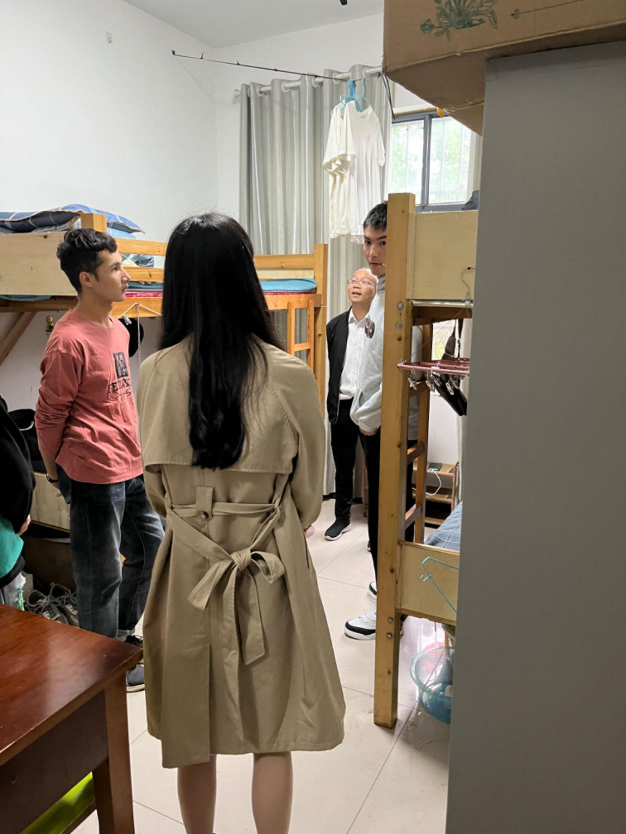 随后,苏书记带队走访了新生西域宿舍,检查了固定位置灭火器材的使用性能,强调寝室内部禁止使用明火、严禁吸烟。本次检查全程未发现违禁大功率电器,但男寝存在内务不整齐,书本、衣物、杂物随意摆放、垃圾清倒不及时的现象。一方面影响宿舍整体的美观程度,另一方面容易滋生细菌,引发疾病。时值雨季,且气温多变,老师们提醒学生注意身体,根据天气加减衣物;离开寝室前打开窗户,多通风换气。