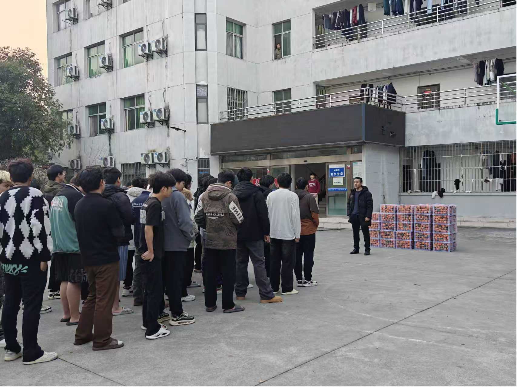 张国法在发放现场与同学们亲切交流。他表示,学校始终关心全日制自考学生的成长与生活,始终践行“让全日制自考生学习生活在汽院同一片蓝天下”的理念,希望这份承载着关爱的心意能为同学们的校园生活增添一抹暖色。同时,张院长也细心叮嘱同学们要增强安全意识,自觉遵守校纪校规与宿舍消防管理规定,共同营造安全、和谐、文明的宿舍环境。他还鼓励同学们珍惜时光、努力学习,争做新时代文明大学生,以实际行动书写充实的大学生活。